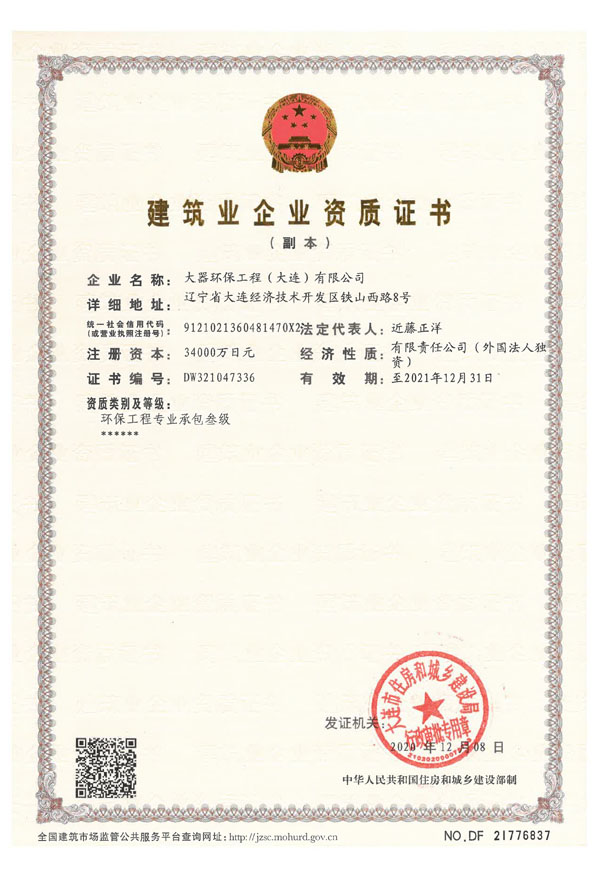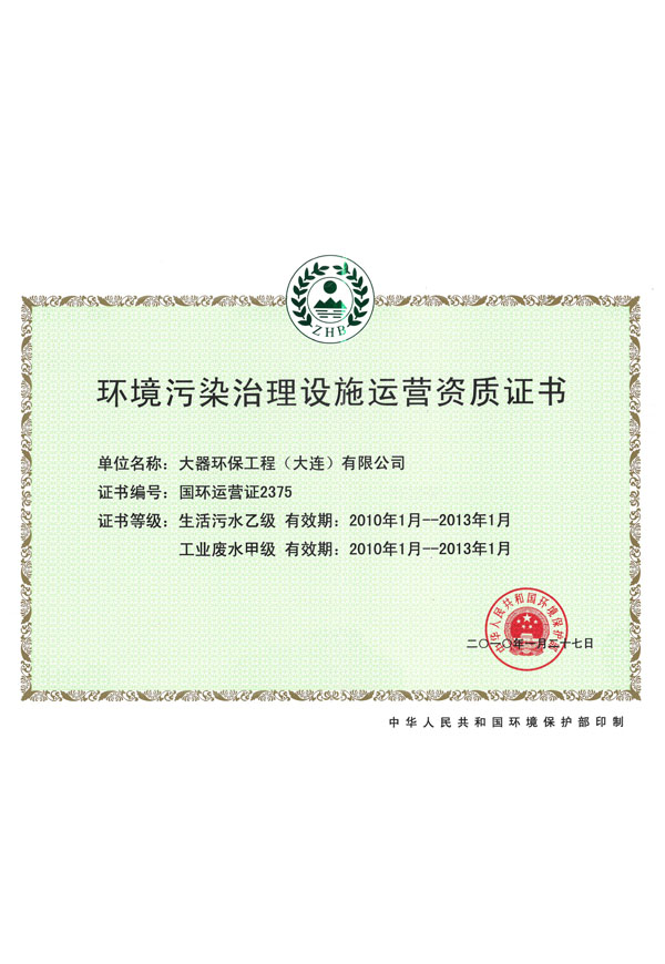 獲得環(huán)境污染治理設(shè)施運(yùn)營(yíng)資質(zhì)(生活污水乙級(jí) 工業(yè)廢水 乙級(jí))