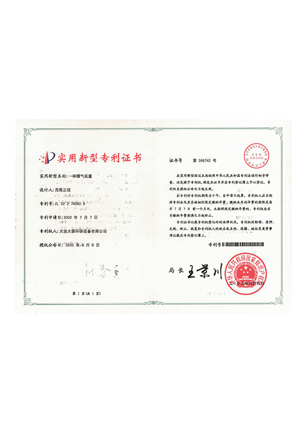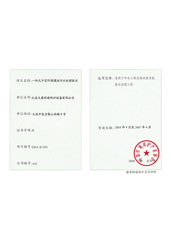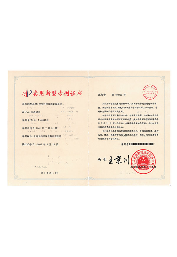 一體式中空纖維膜實(shí)用技術(shù)證書(shū)